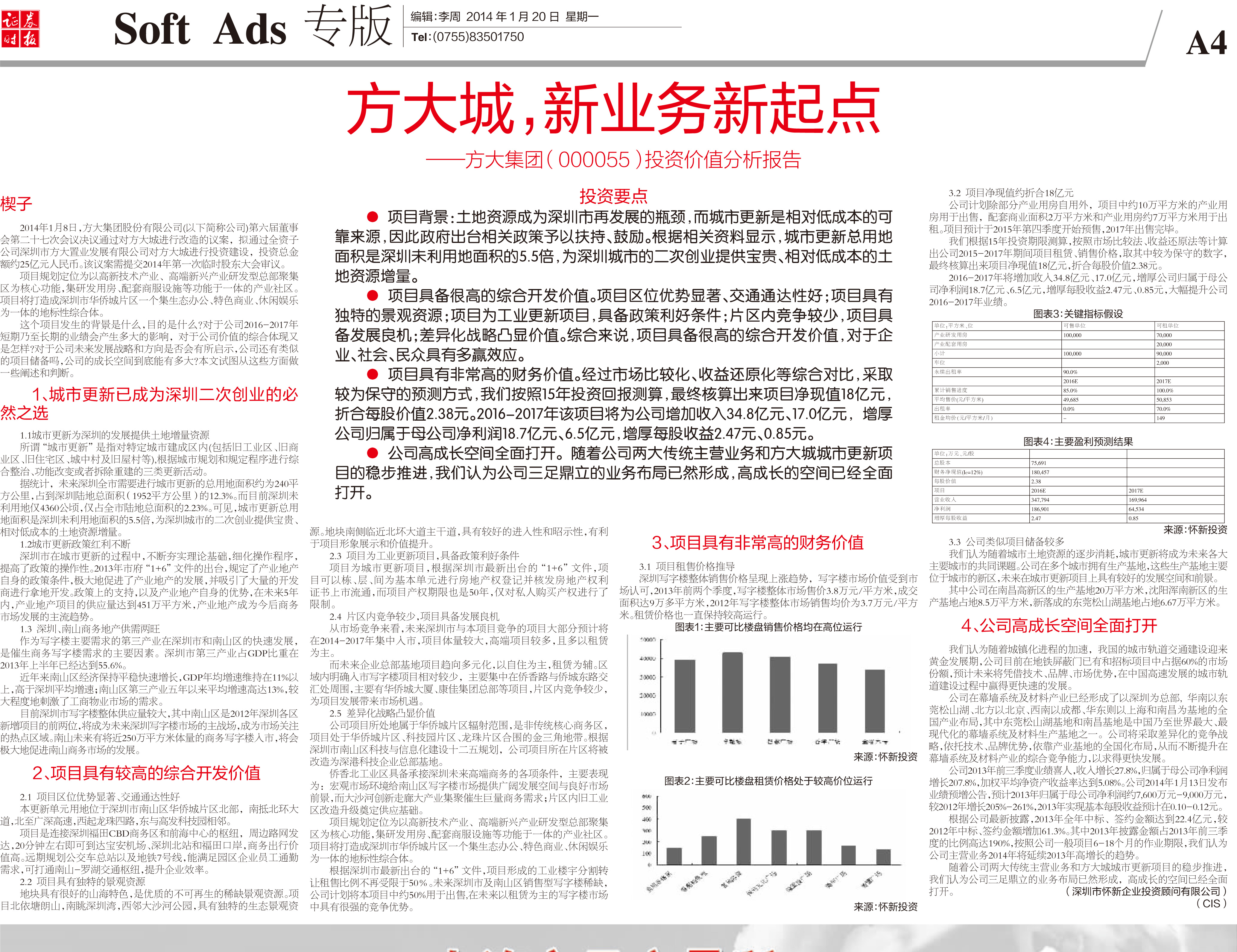 2014年1月20日《證券時報》專版大幅刊登《方大城,新業務新起點——方大集團投資價值分析報告》
