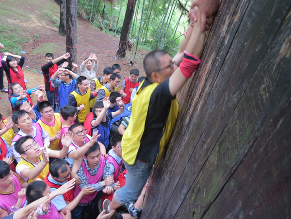 本次拓展訓練最感動人的項目莫過于最后的攀爬“畢業(yè)墻”,教官告訴大家:“沒有任何保險措施,什么道具都不能用,全隊學員必須在不違反規(guī)則的情況下,在規(guī)定的時間內(nèi)全部翻越畢業(yè)墻才算成功,拓展訓練才算畢業(yè)。”怎么辦?只有團隊的力量才能翻越畢業(yè)墻,最后大家協(xié)商是第一排四個,一人手扶墻,一人抱緊對方的腰,其他人踩著他們的肩膀上去,先爬上去的人再用手拉下面的人上去,每一位隊員心中都暗暗鼓勵自己要勇敢,踩上隊員肩膀的時候,身后有幾十雙有力的手托住,一股力量在支持我們向上攀越,一種從未有的安全感油然而生,也充滿了勇氣。當所有人出色的翻越過畢業(yè)墻后,大家的眼睛已經(jīng)濕潤了,最終的感動戰(zhàn)勝了辛苦。