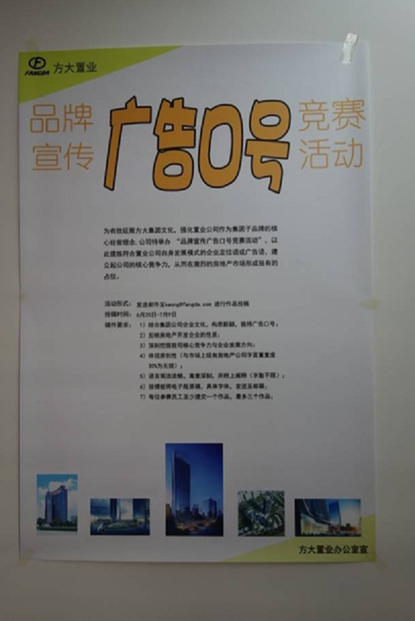 7月16日,方大置業(yè)“品牌宣傳廣告語口號競賽”活動決賽在方大廣場綜合樓三樓會議室舉行。經(jīng)過三周時間的征稿、作品展示、初選、復選,最終選出了十篇優(yōu)秀作品進入決賽。方大置業(yè)總經(jīng)理及相關(guān)領導、辦公室和營銷策劃部負責人擔當本次決賽評委。