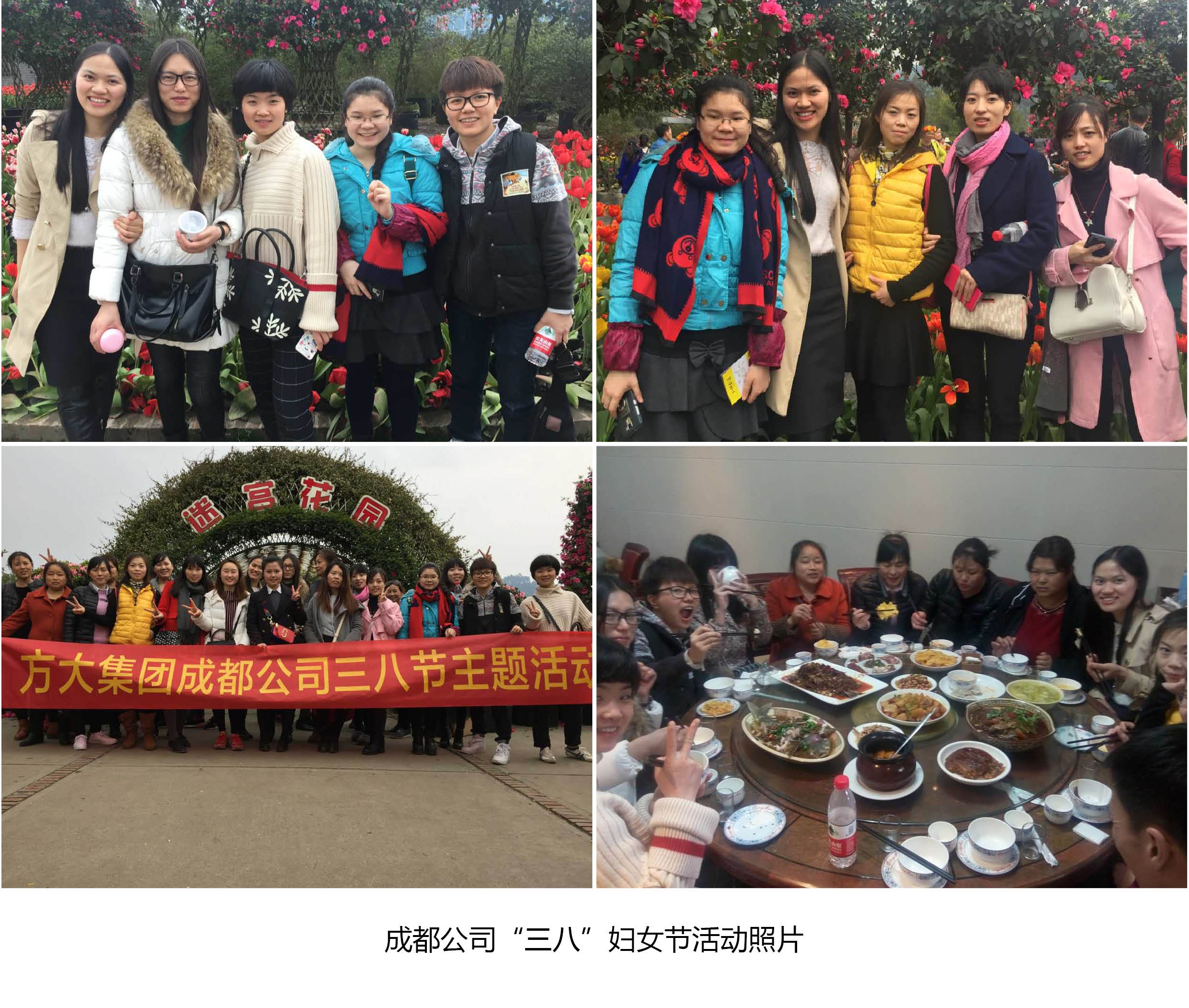 在成都,成都公司組織全體女員工前往位于成都市南郊的“花舞人間”國家4A級景區進行半日游活動。期間,大家進行了賞花、趣味小游戲和聚餐等。此次活動有效的增進了方大成都公司女員工彼此間的情誼,豐富了公司的企業文化。