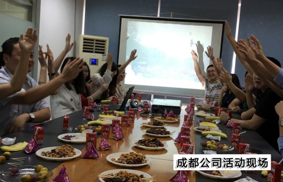 在方大集團(tuán)成都公司,9月30日下午舉辦了一次輕松、熱鬧的中秋茶話會(huì)。團(tuán)聚和暢聊是這次活動(dòng)的主要內(nèi)容,活動(dòng)現(xiàn)場歡笑聲、祝福聲不絕于耳,精心準(zhǔn)備的水果點(diǎn)心、悠揚(yáng)的音樂和中秋主題背景共同營造了濃濃的中秋佳節(jié)氛圍。在這花好月圓的時(shí)刻,雖然員工們遠(yuǎn)離家鄉(xiāng),但方大人聚在一起,就是相親相愛的一家人。