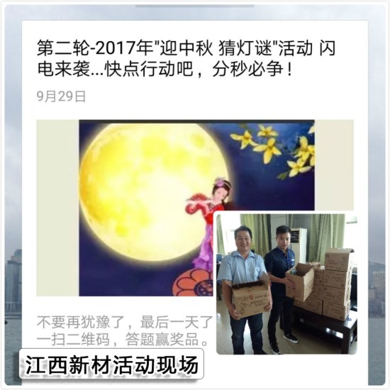在方大集團(tuán)江西公司,9月28日、29日舉行了一次別開生面的“迎中秋猜燈謎”線上活動(dòng)。為了讓公司員工感受到節(jié)日濃厚的氣氛,同時(shí)又能搭建企業(yè)文化交流的橋梁,此次活動(dòng)由傳統(tǒng)猜燈謎改為微信猜燈謎方式進(jìn)行。員工們通過關(guān)注公司微信公眾號(hào)后,即可在線參與解答猜燈謎的活動(dòng)。通過這次“迎中秋猜燈謎”活動(dòng),極大地激發(fā)了員工們關(guān)注公司微信公眾平臺(tái)的激情,也為員工們留下了一段難忘的節(jié)日回憶。