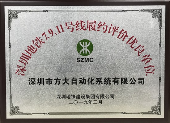 近日,深圳地鐵建設(shè)集團有限公司授予方大集團全資子公司方大智創(chuàng)科技有限公司(原深圳市方大自動化系統(tǒng)有限公司)“履約評價優(yōu)良單位”獎。