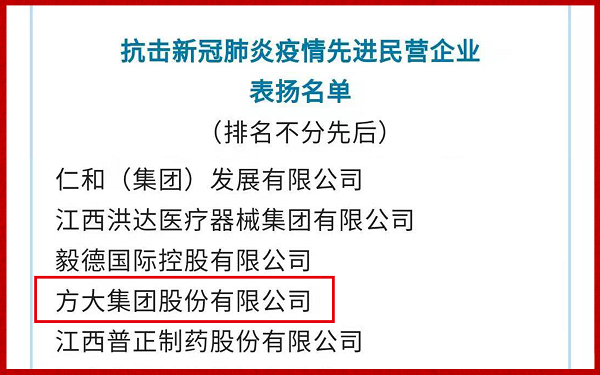 近日,中華全國工商業聯合會發布《全國工商聯關于對抗擊新冠肺炎疫情做出優異成績的先進民營企業予以表揚的通報》,對“抗擊新冠肺炎疫情先進民營企業”給予表揚,方大集團榜上有名。